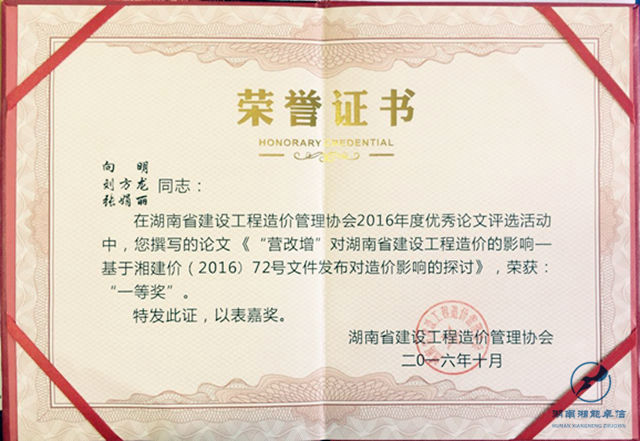 2017年2月28日下午,湖南省建設工程造價管理協會在省委招待所舉行了2016年工程造價優秀論文交流表彰會,我公司共有11篇論文獲獎,其中向明、劉方龍、張娟麗撰寫的《淺析“營改增”對湖南省建設工程造價的影響》獲得一等獎。